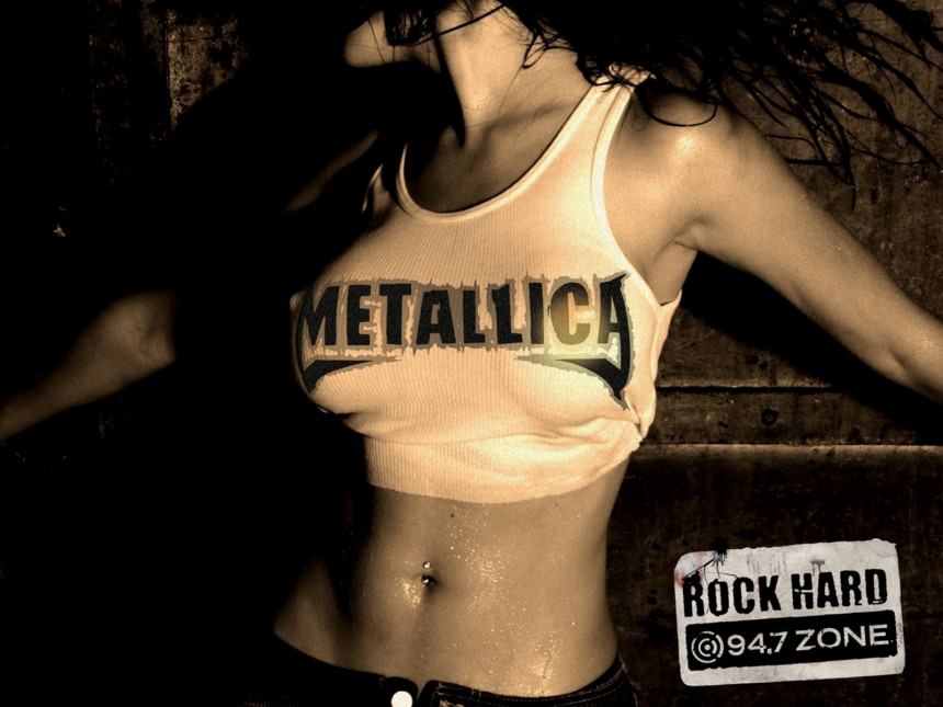 Поклонница, группы, "Metallica", промокла, под, дождем, мокрая, девушка, с, сексуальным, животиком, и, в, белом, топике
