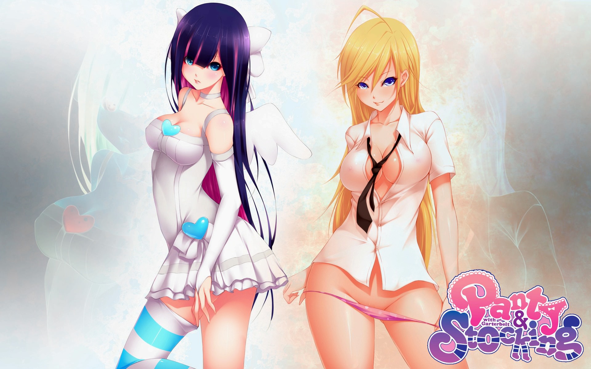 Две очаровашки, соблазнительные девушки, блондинка и брюнетка с аппетитными формами, сексуальная блондинка в розовой облегающей рубашке и с галстуком, спускает с себя розовые трусики, голубые глаза и возбуждающее тело, рядом ее не менее сексуальная подружка в белом платье снимает чулочки.