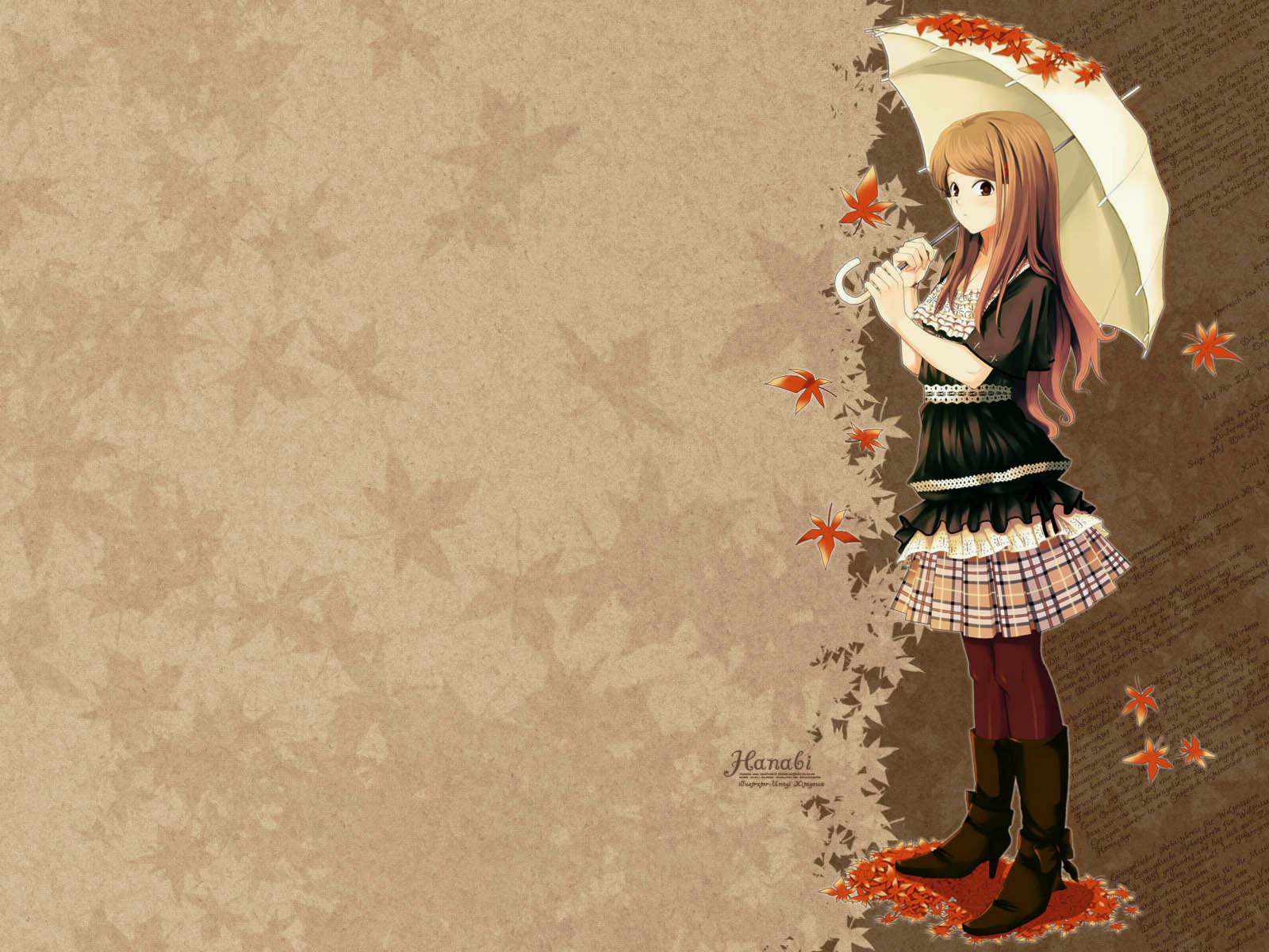 Девочка, с, зонтиком, в, платье, в, сапожках, листва, листья, осень