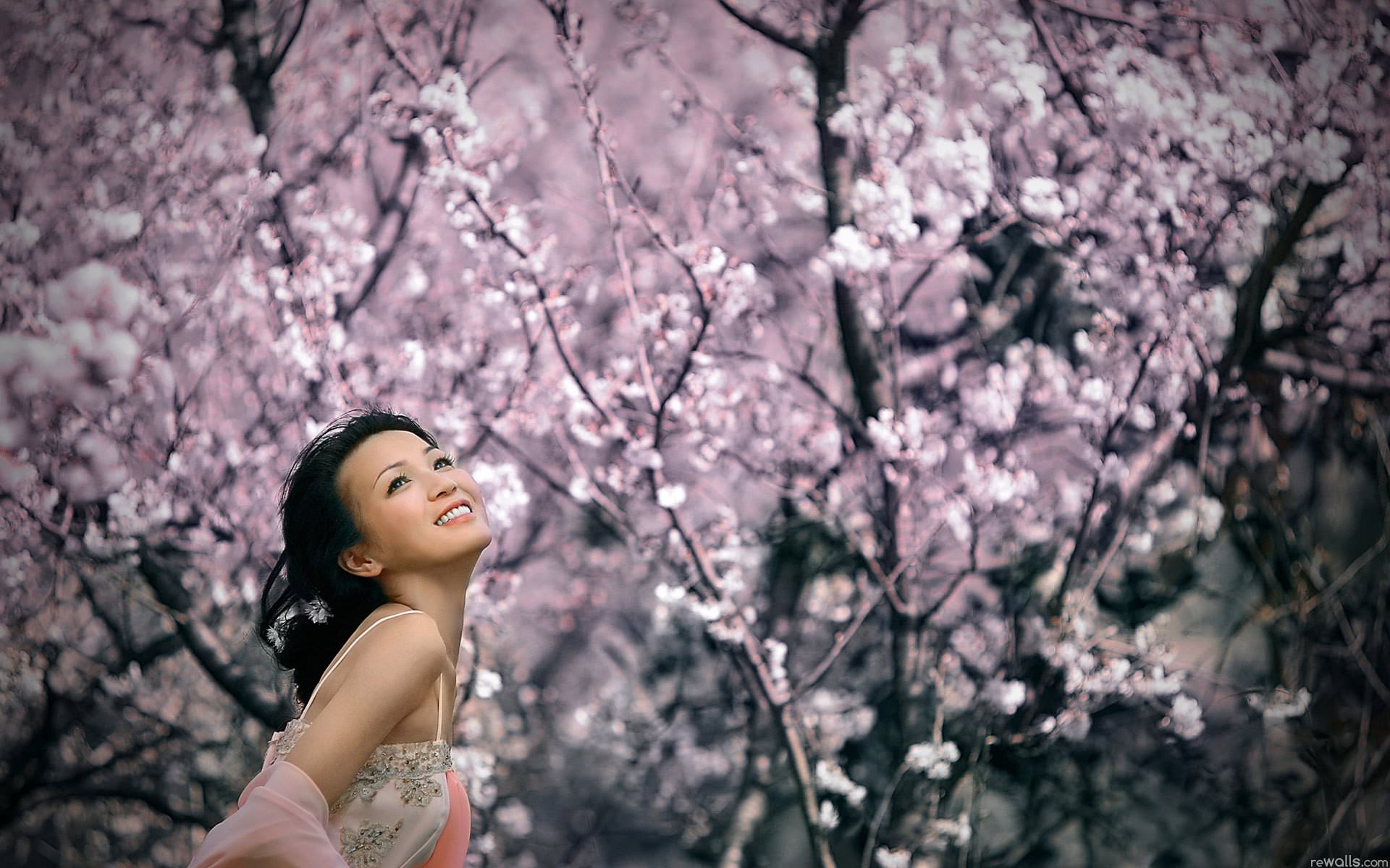 Японка, радуется, сакуре, азиатка, в, японском, саду, розовые, лепестки, сакуры