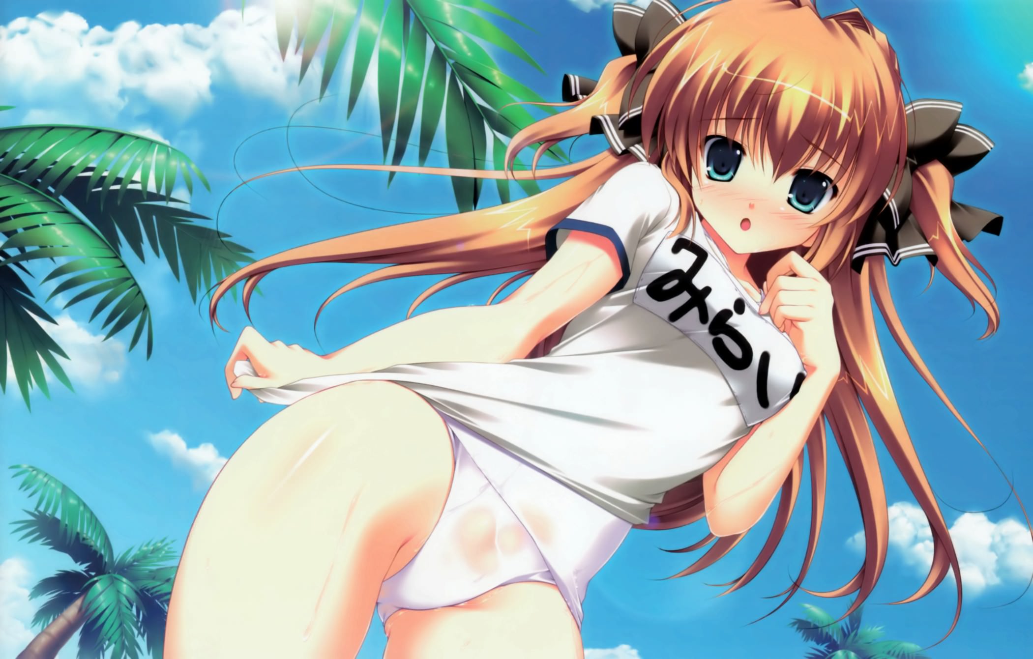Красивая, девочка, в, трусиках, и, футболке, под, солнцем, и, пальмами, знойная, красотка, в, белых, трусиках, под, голубым, небом