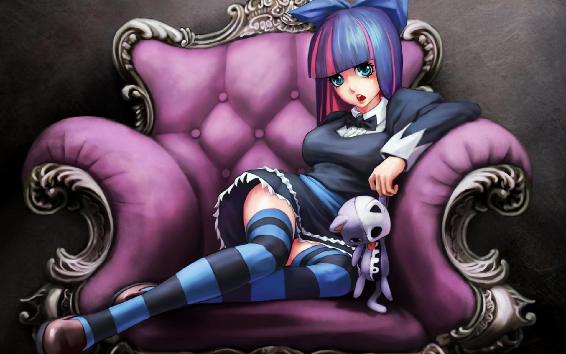 "Крошка" на диване, сексапильная девочка в полосатых чулках и в платье сидит на фиолетовом кресле с плюшевым котом в руке, голубые глаза и синий бант на голове.