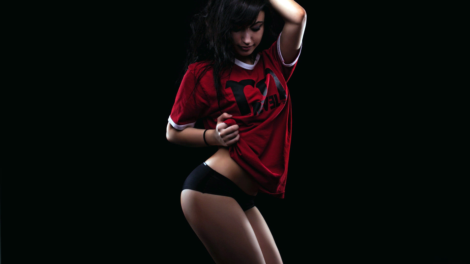 Девушка заигрывает, поднимая футболку, брюнетка в мужской футболке, красивая фигура, черные трусики.