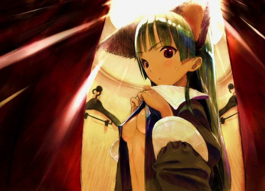Смущенная девочка пытается прикрыть свою обнажившуюся грудь.