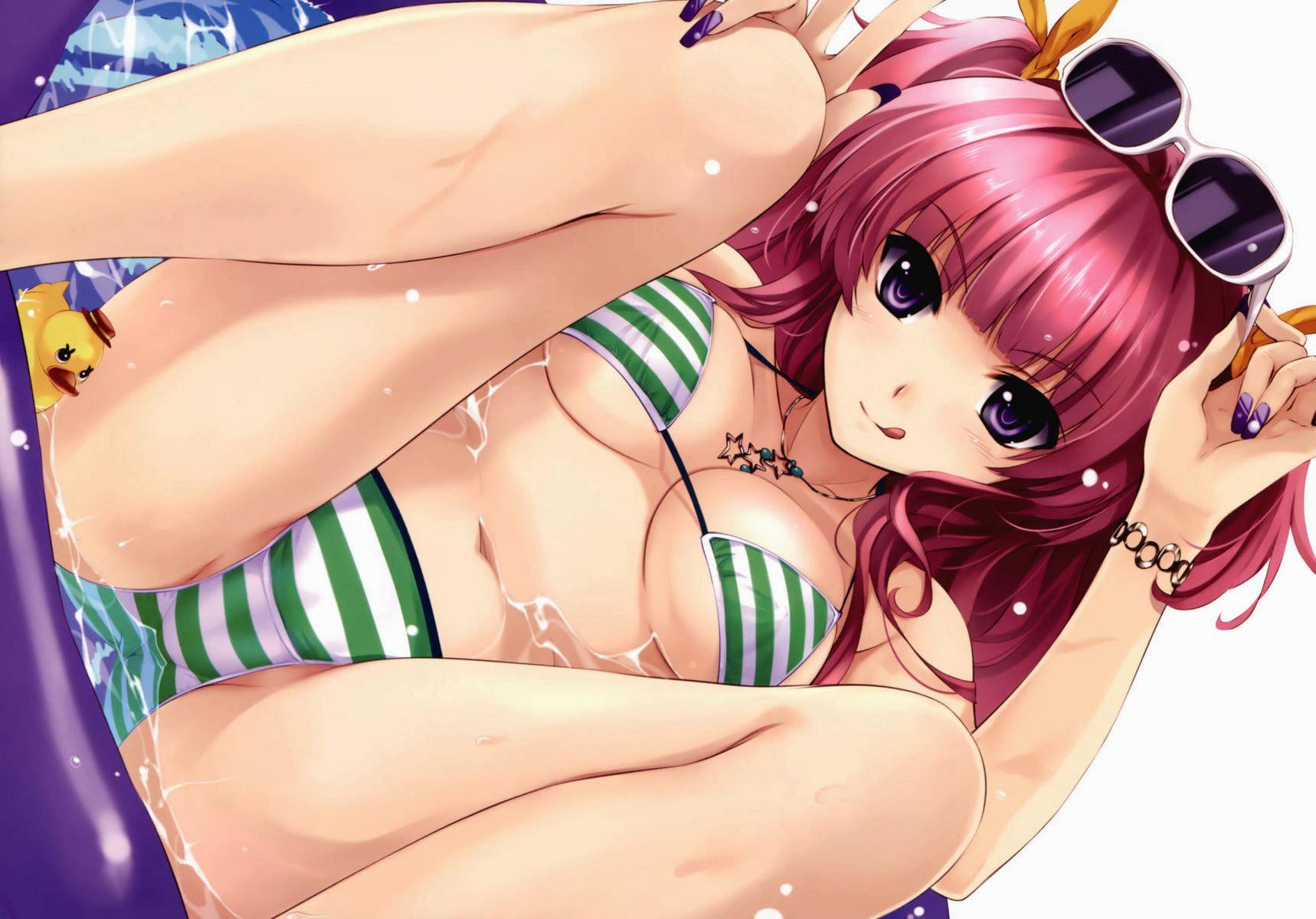 Сексуальная девушка в бикини в воде на кругу, девушка в полосатом бело-зеленом бикини сидит в надувном круге на воде и сексуально облизывается приподняв солнечный очки с глаз.