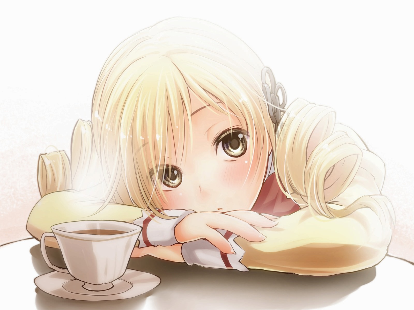 Девочка с чашкой кофе за столом, сильно задумалась о чем-то и ее взгляд устремился куда-то в сторону, задумчивая девочка со светлыми волосами, чашка кофе на столе.