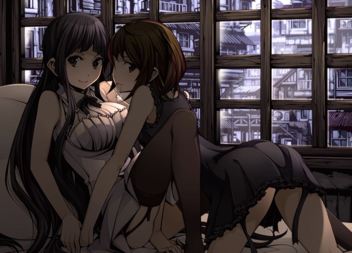 Две прекрасные девушки шалуньи уединились в номере, длинноволосая брюнетка в платье с большой грудью и шатенка в черном облегающем платье с короткой юбкой, лезет ласкаться к подруге.
