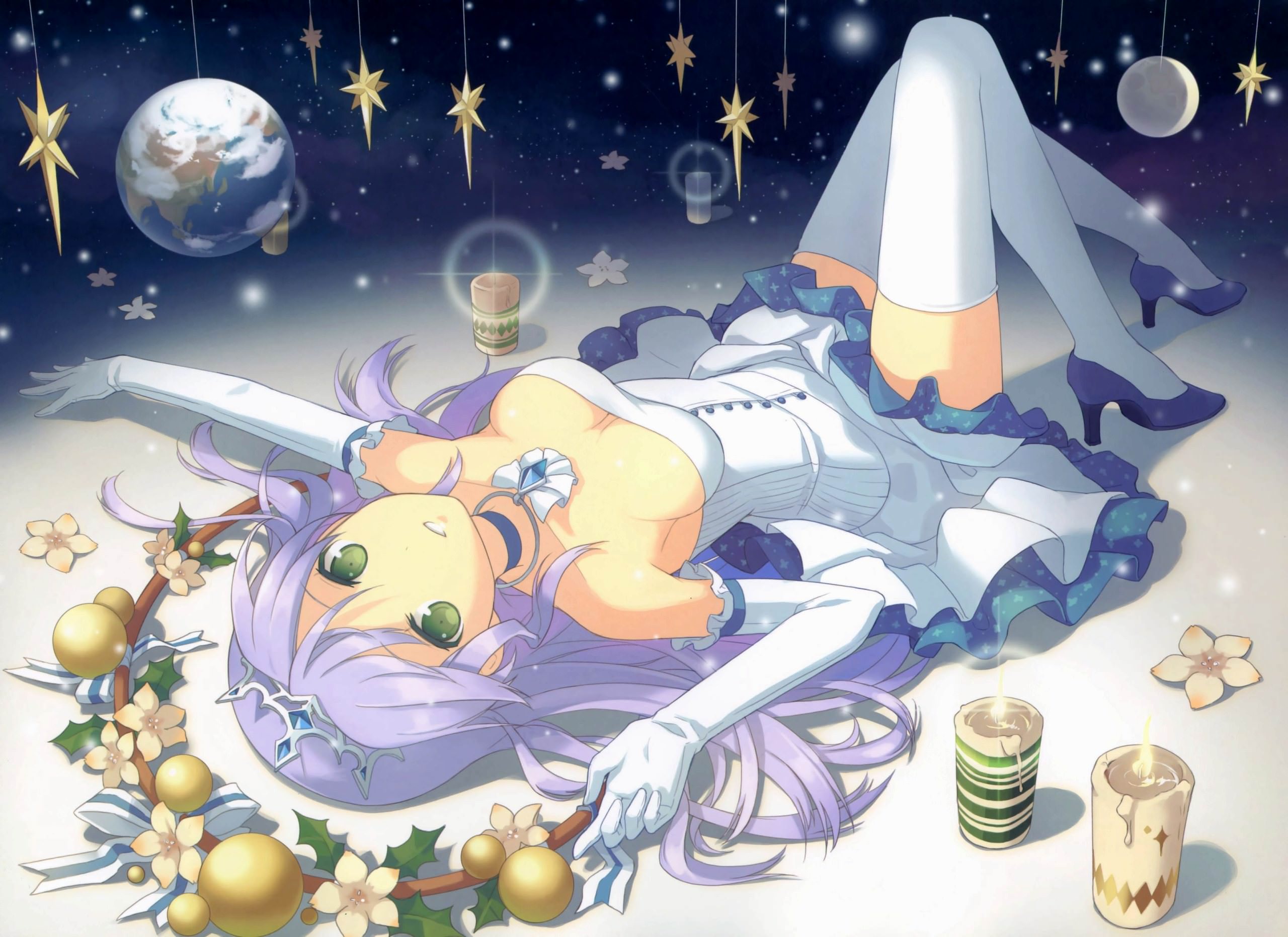 Невеста замечталась, девушка в белом платье, в белых чулочках, красивая грудь, свечи, цветы, гирлянды.