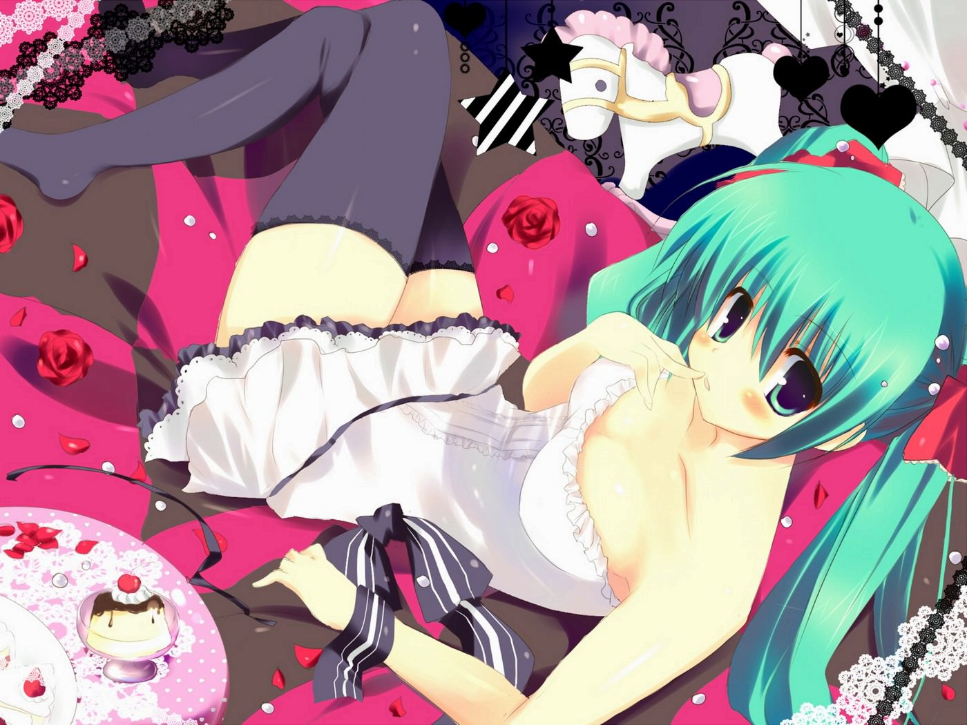 Очаровательная красотка в летнем платье в чулочках, сексуальная девушка в белом платье с короткой юбкой, в черных обтягивающих чулках, голубые волосы, сладости и игрушки вокруг, милые глазки.