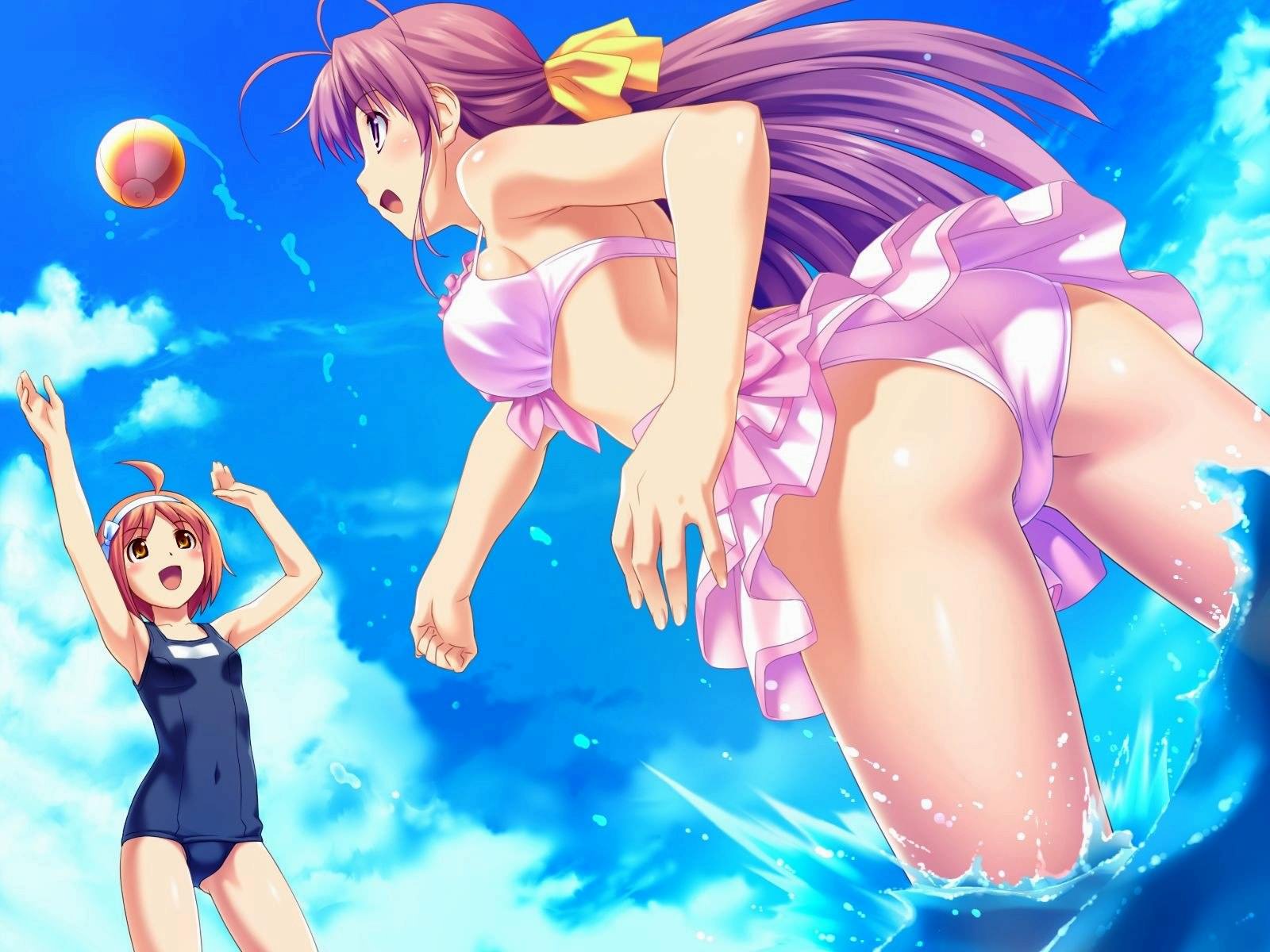 Школьницы играют в мяч на море летом, девочки отдыхают в солнечную погоду в бикини, играют с мячом под голубым небом в воде, девочка в розовом бикини.