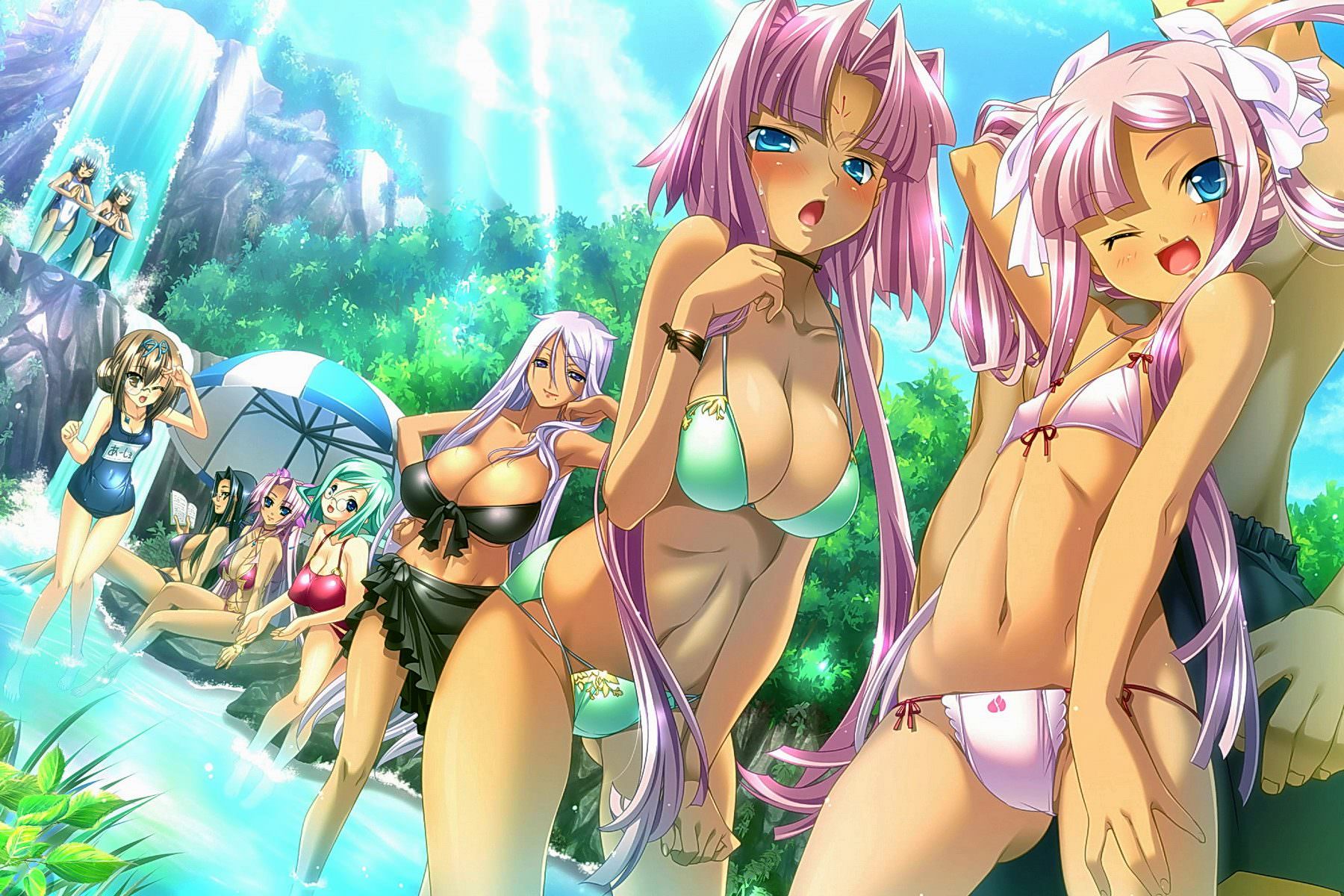 Девушки в бикини у водопада, красивые и сексуальные девушки в бикини отдыхают у водопада, в зеленом лесу, под лучами солнца и голубым небом.