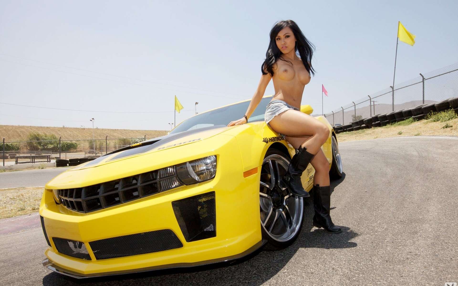 С голой грудью, в коротких шортах у желтой авто, брюнетка у желтой тачки.