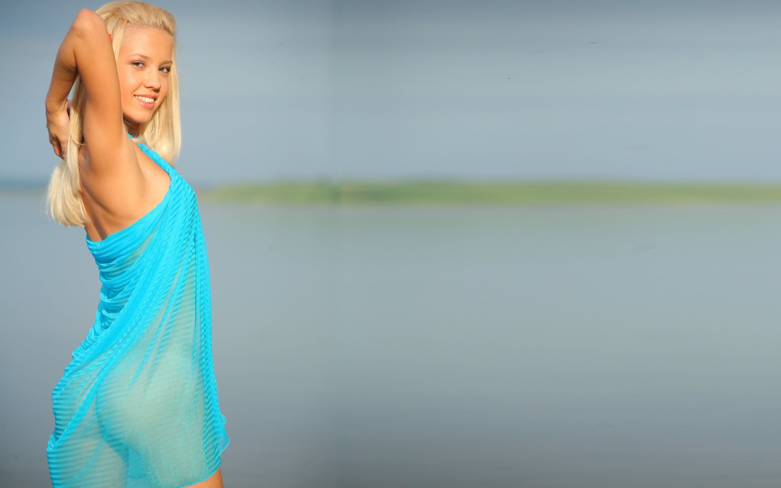В голубой прозрачной накидке на фоне реки, блондинка в накидке, голая попка, красивое милое лицо.