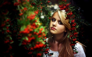 Обнаженная, блондинка, прикрывает, грудь, волосами, у, дерева, красивые, глаза, милое, лицо