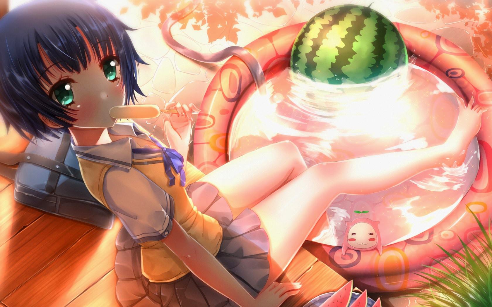 Девочка ест мороженное и булькается ножками в воде, девочка охлаждает ножки в надувном круге, наполненном водой, арбуз в воде, школьница облизывает мороженку.