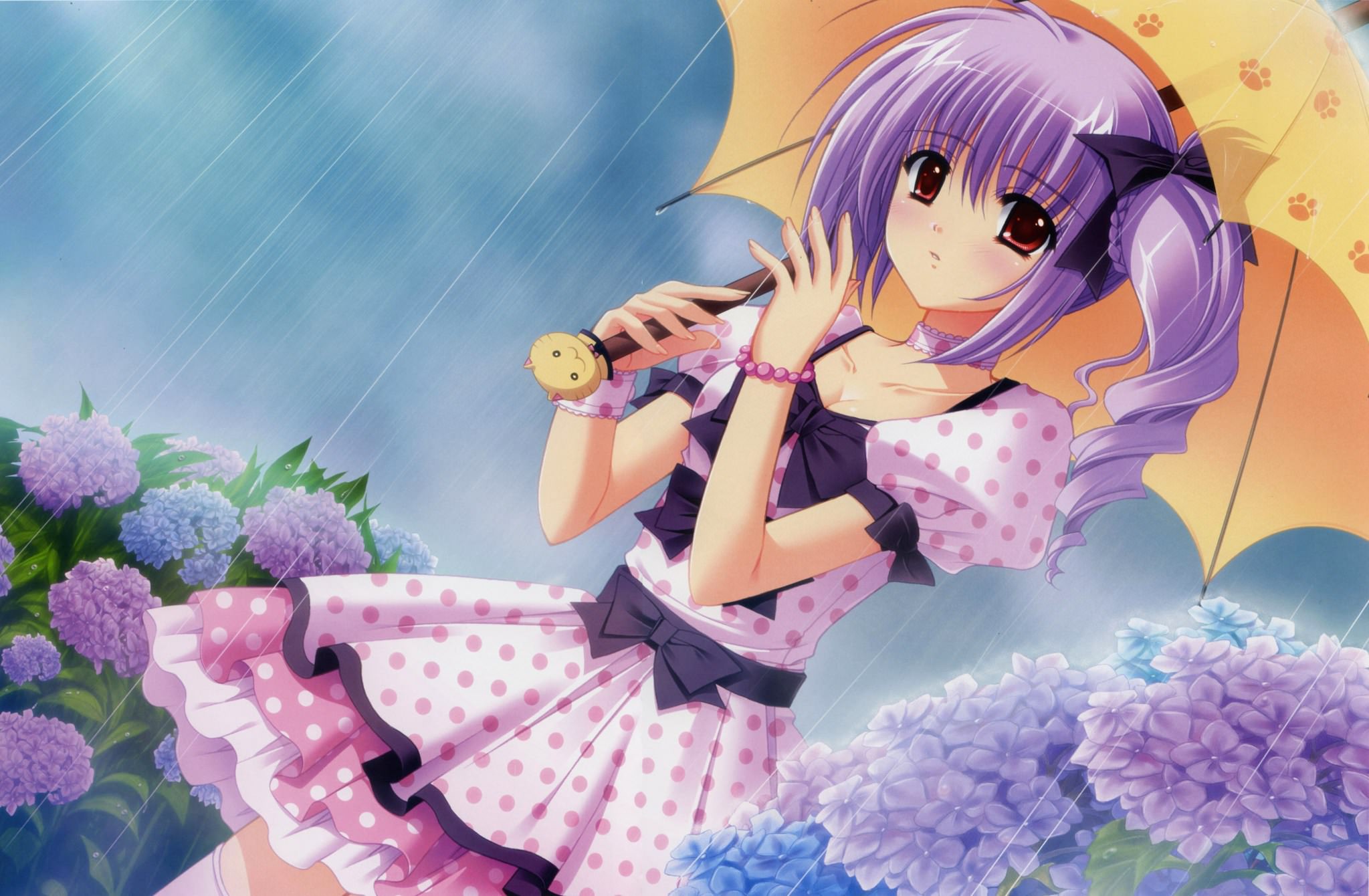 Девушка в гороховом платье с зонтиком под дождем, красивая аниме девушка в светлом платье в горошек, черный бантики, желтый зонт, идет по саду, цветы и дождь.