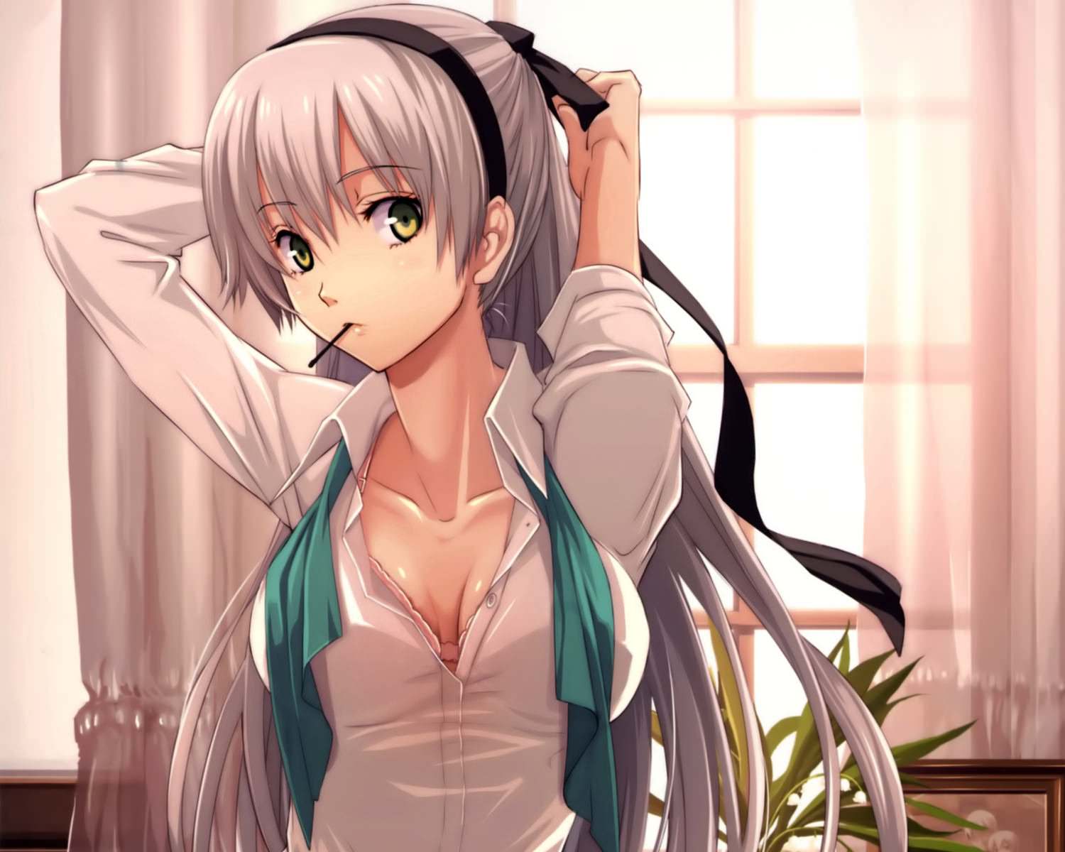 На работу мне пора, начальник ждет. Любовница большого босса, девушка собирается на работу в офис, одела рубашку, оставив расстегнутыми верхние пуговицы, чтобы грудь смотрелась ярко, собирает длинные волосы в ленточку.