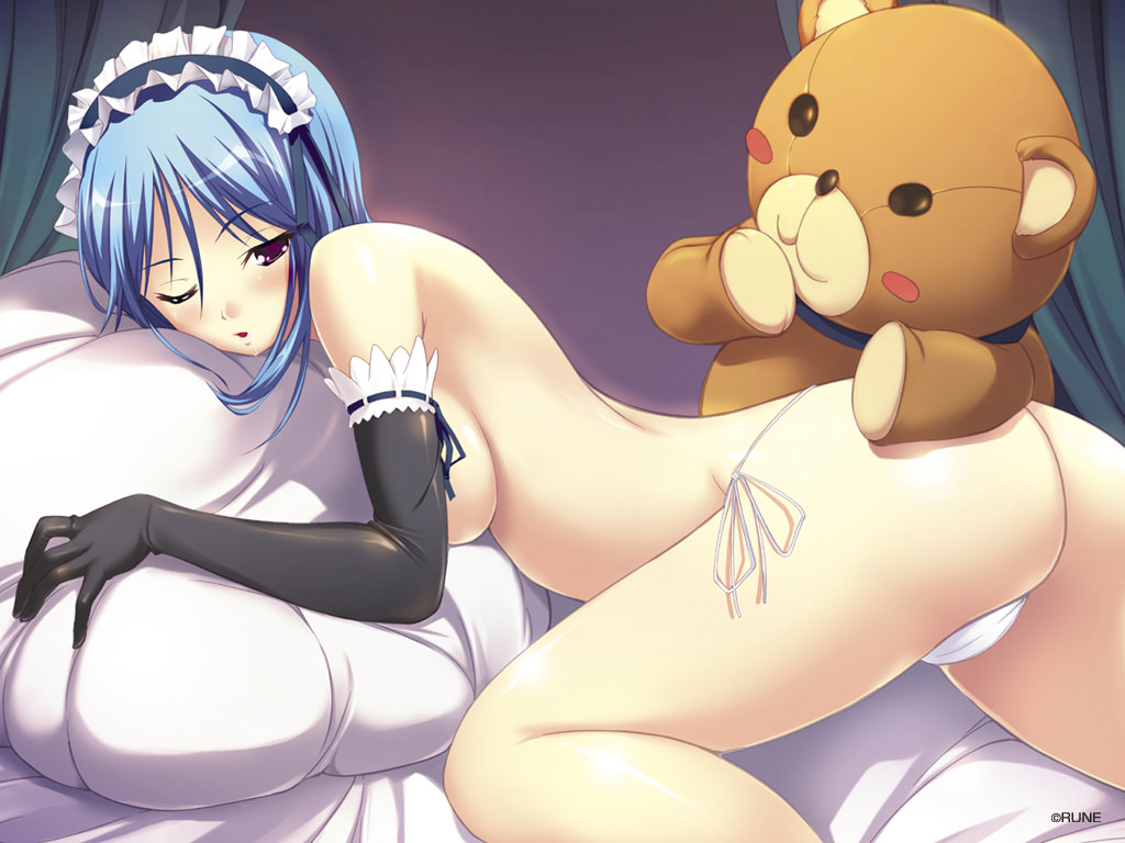 Плюшевый мишка ублажает полуобнаженную домработницу, служанка в одних трусиках и перчатках с сексуальным телом, лежит на большой белой подушке с большим плюшевым медведем, плюшевый мишка положил свою лапу на ее попку.