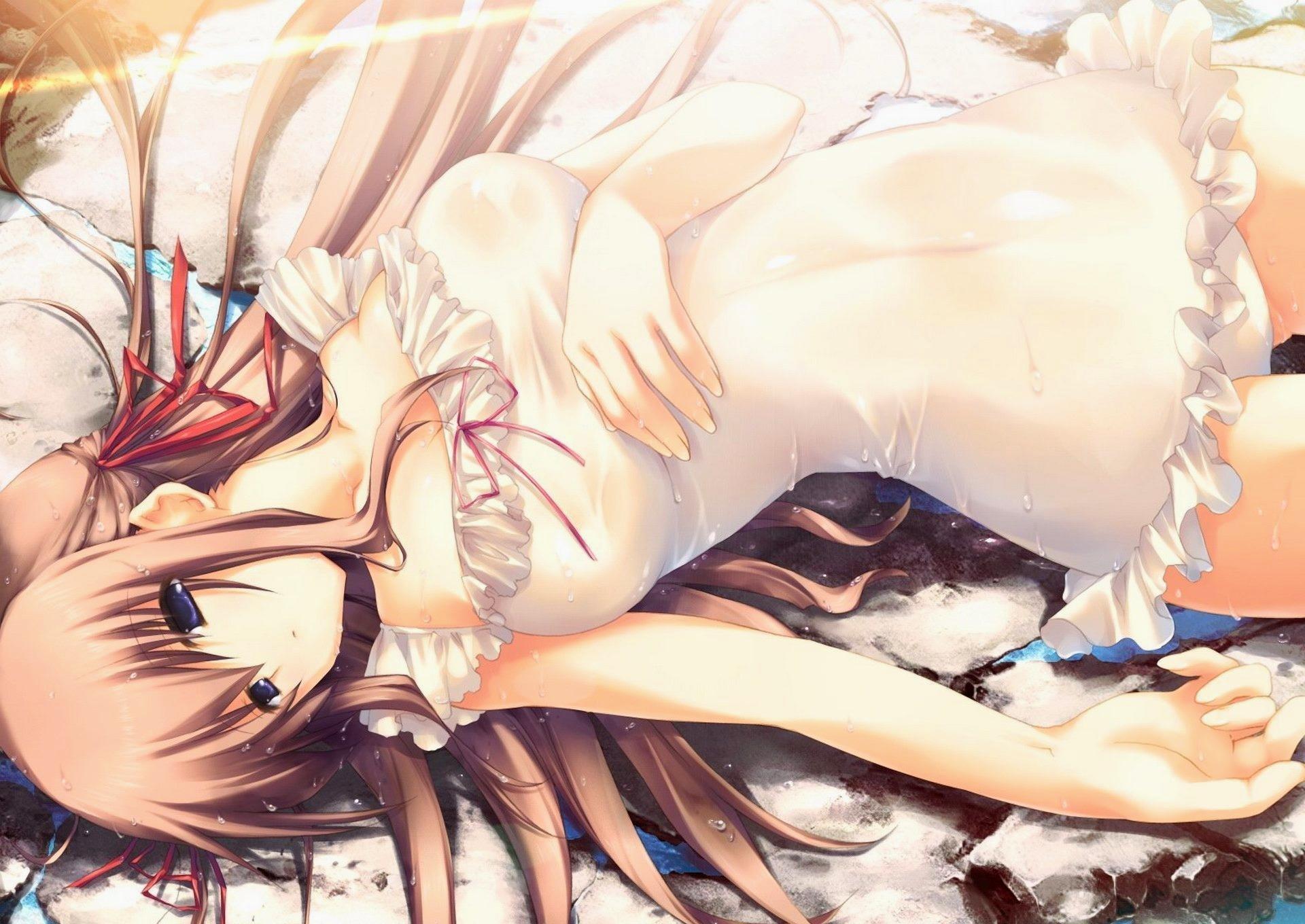 Милая девушка в полупрозрачном белом коротком платье лежит на камнях, большая грудь просвечивает сквозь одежду.