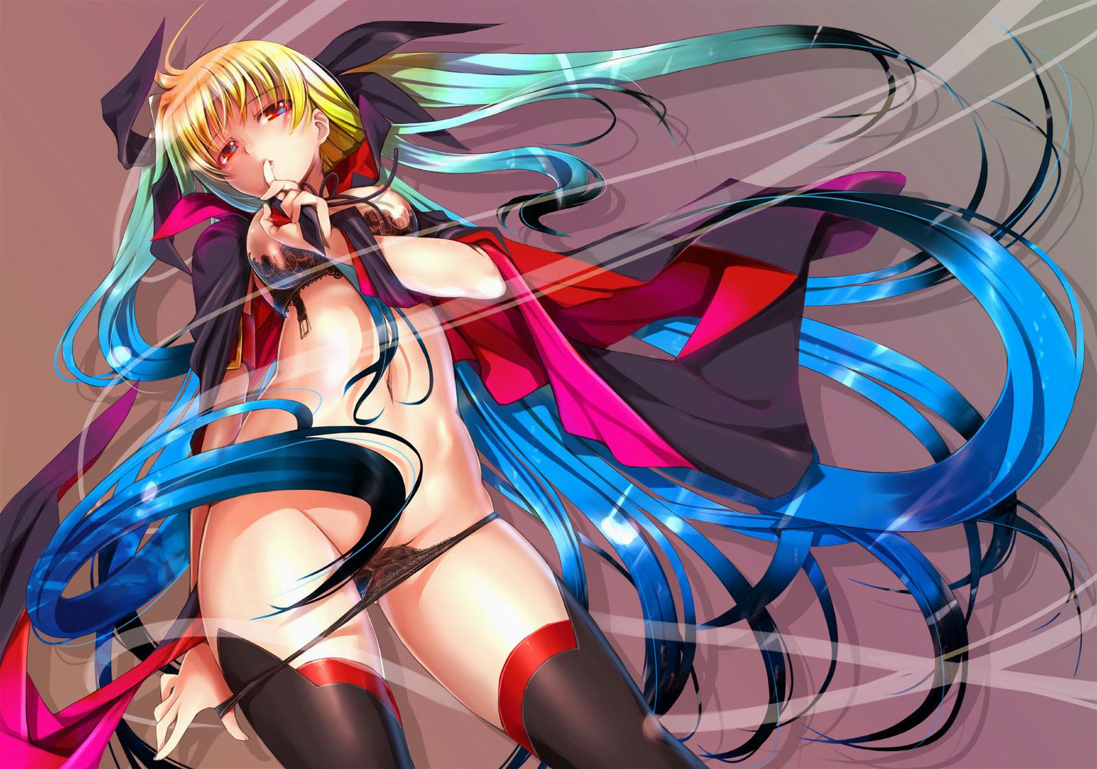Яркие длинные волосы, сексуальная девушка стягивает трусики, приложив пальчик к губам.