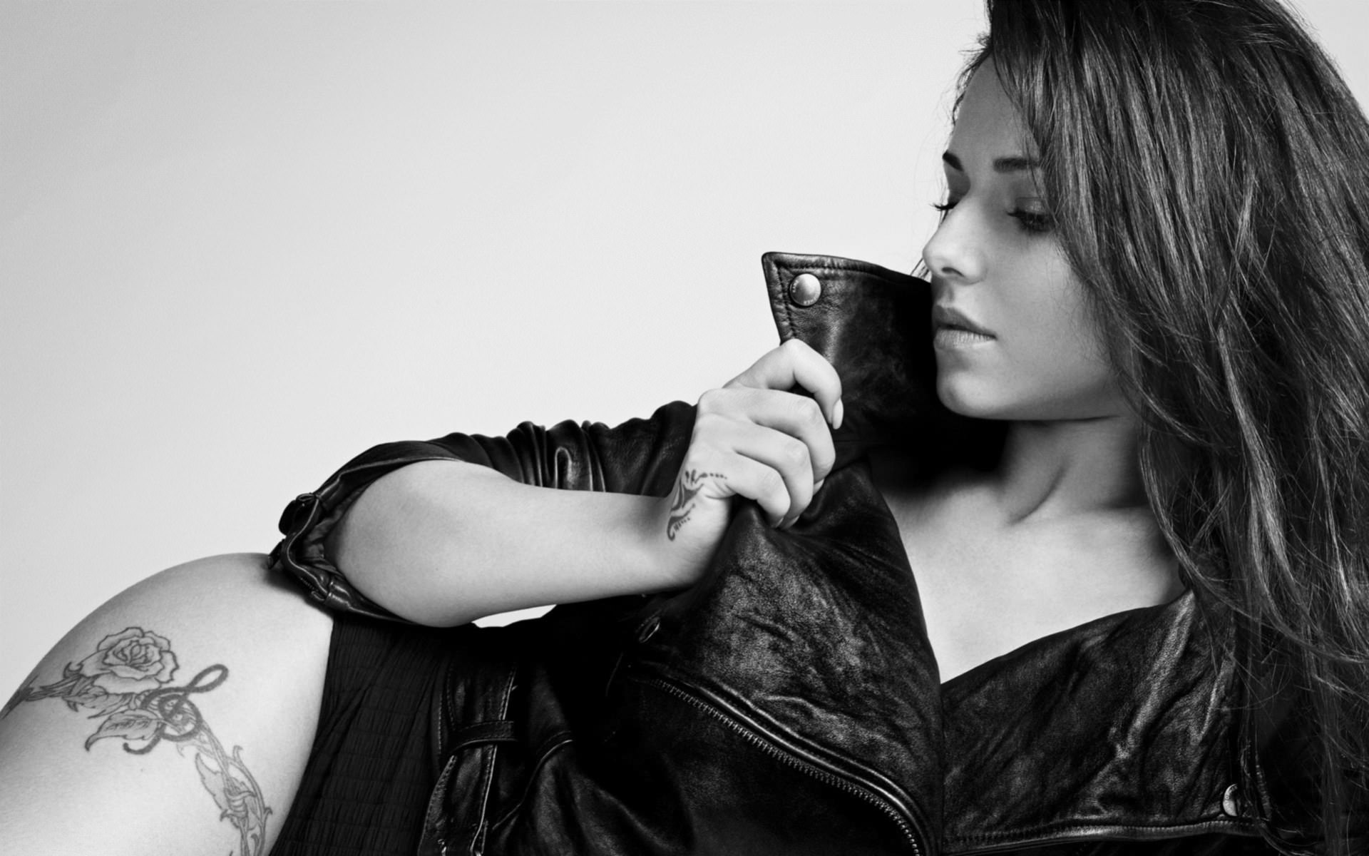 Девушка в черной кожаной куртке, тату на бедре, черно-белые краски, justgirls (826).