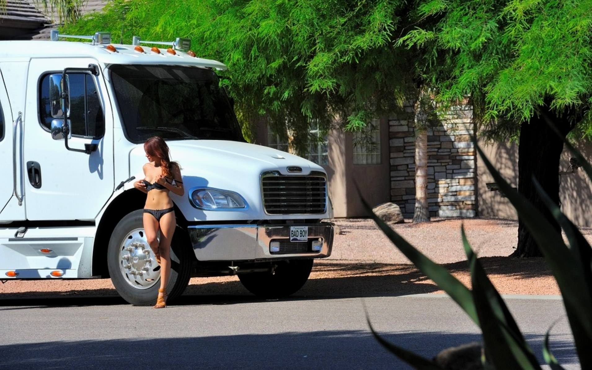 Сексуальная, девушка, в, бикини, прислонилась, к, огромному, грузовику, показывает, сиськи