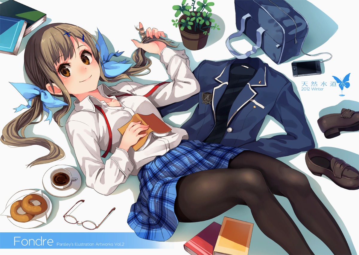Школьница, с, книжкой, разбросаны, вещи, вокруг, ножки, в, колготках, синяя, клетчатая, юбка, от, школьной, формы, улыбается