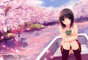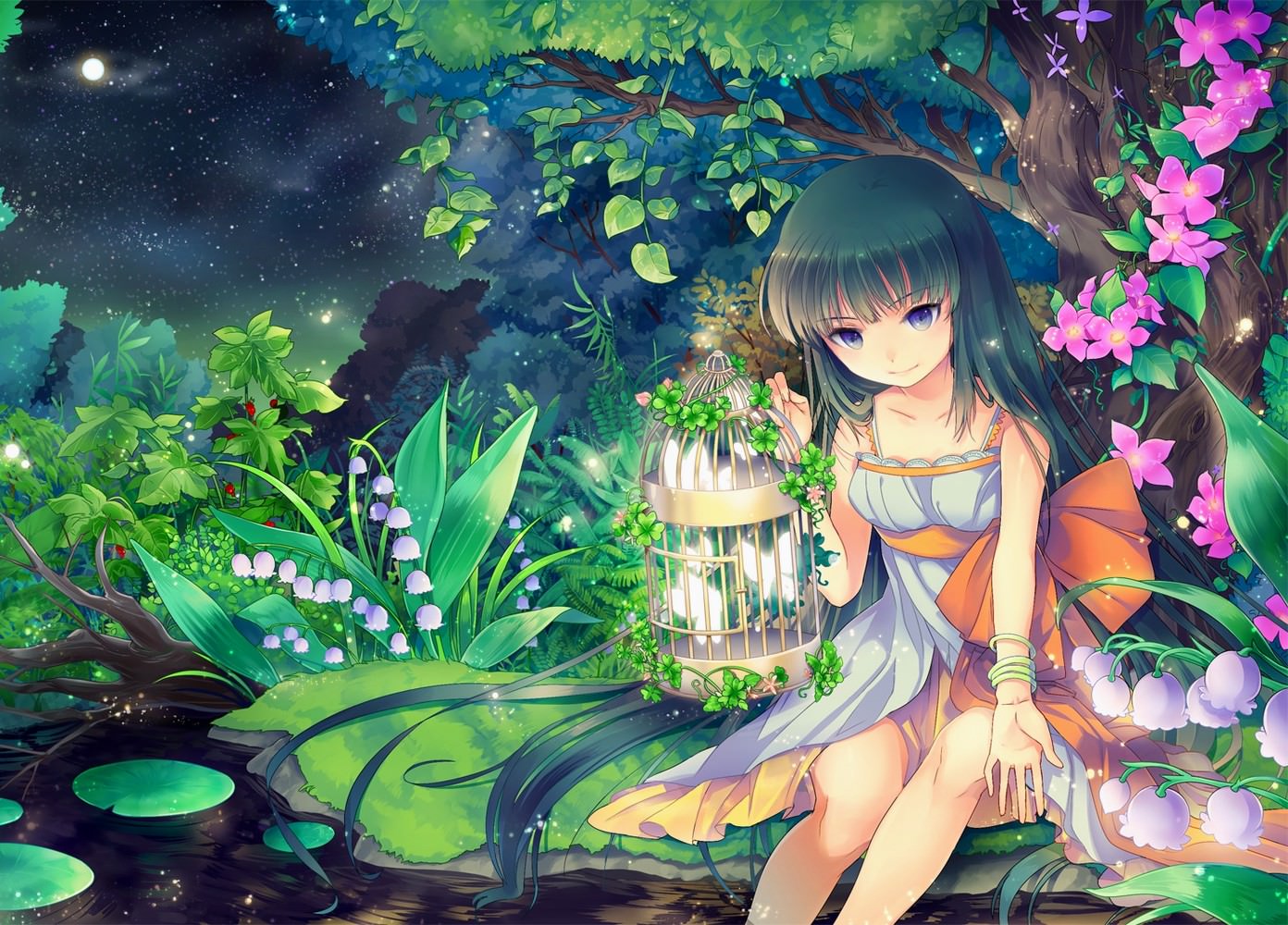 Девушка, словно фея, сидит ночью у речки в волшебном лесу, держит клетку со светящимися бабочками, окунула ножки в речку, в светлом платье.