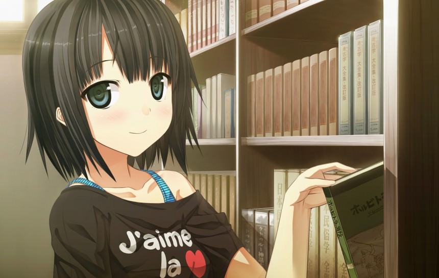 Милая дувочка в красивой черной футболке выбирает книжку в библиотеке.