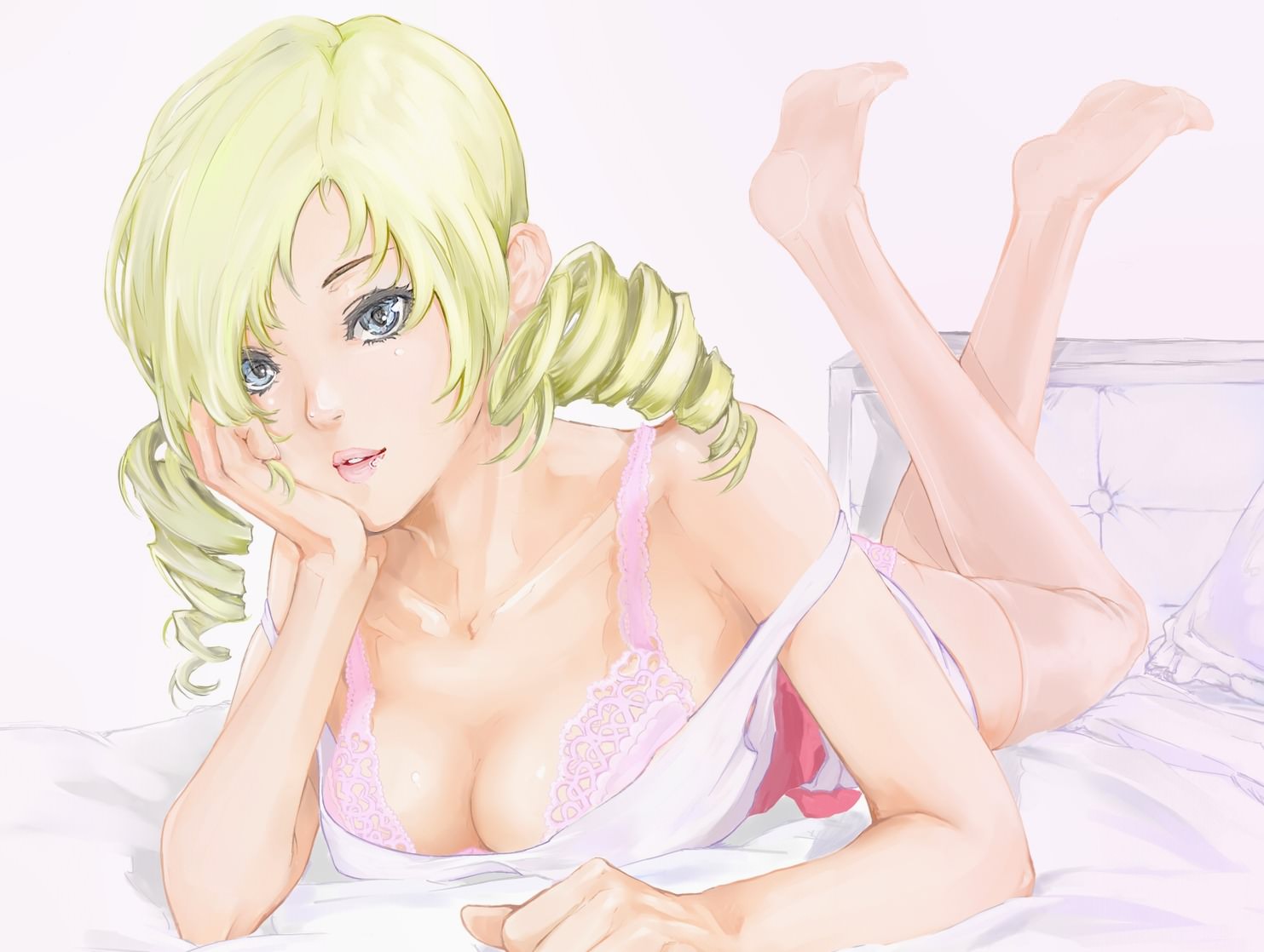 Блондинка летает в облаках, красивая девушка с голубыми глазами лежит на кровати и мечтает о чем-то, розовый лифчик, машет ножками.