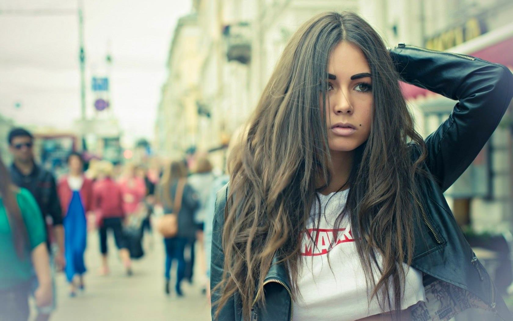 Красивая девушка в городской толпе, смотрит в даль городских улиц, красивая длинноволосая брюнетка в кожаной куртке.