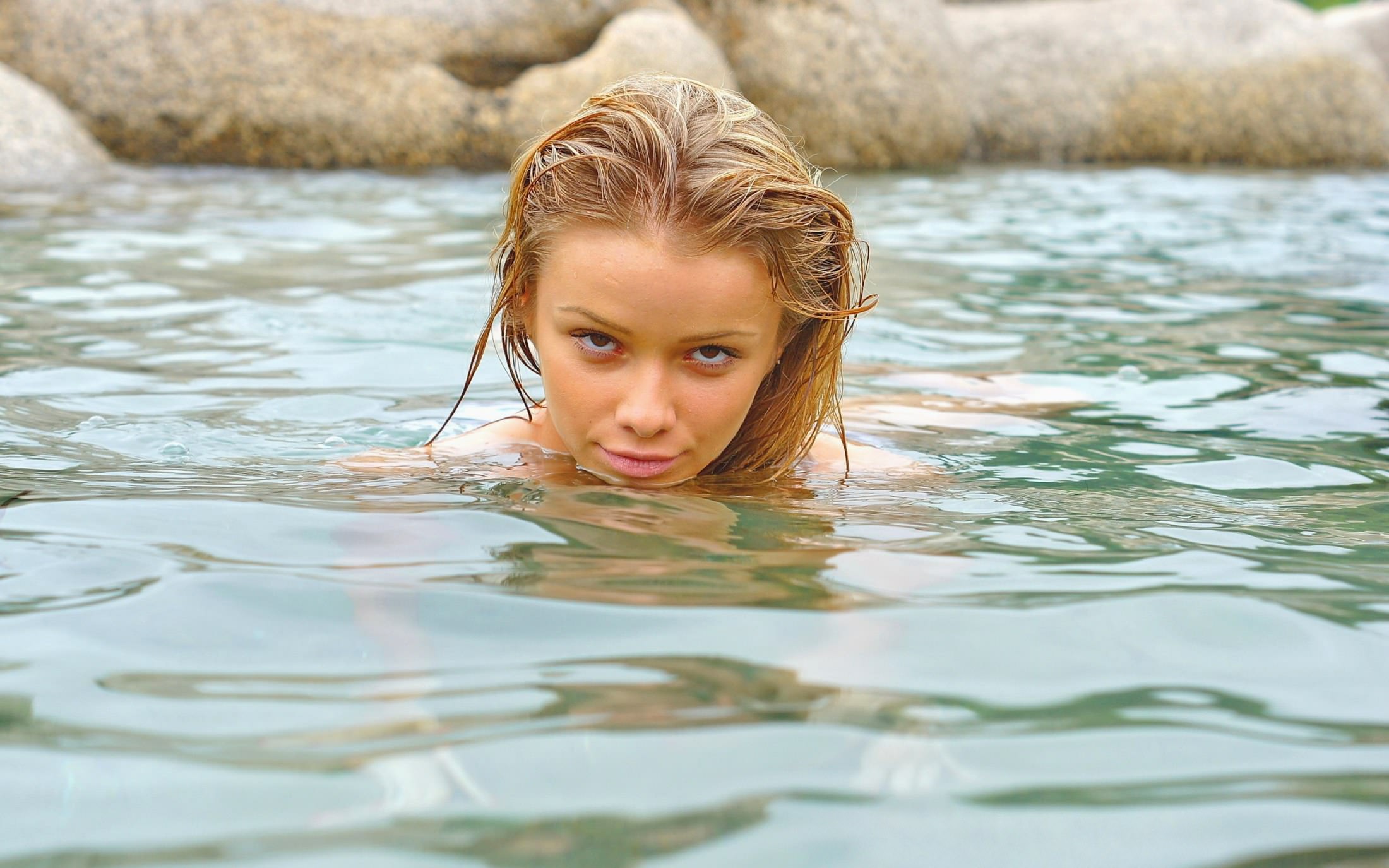 Девушка высунула голову из воды, соблазнительный взгляд из водоема.