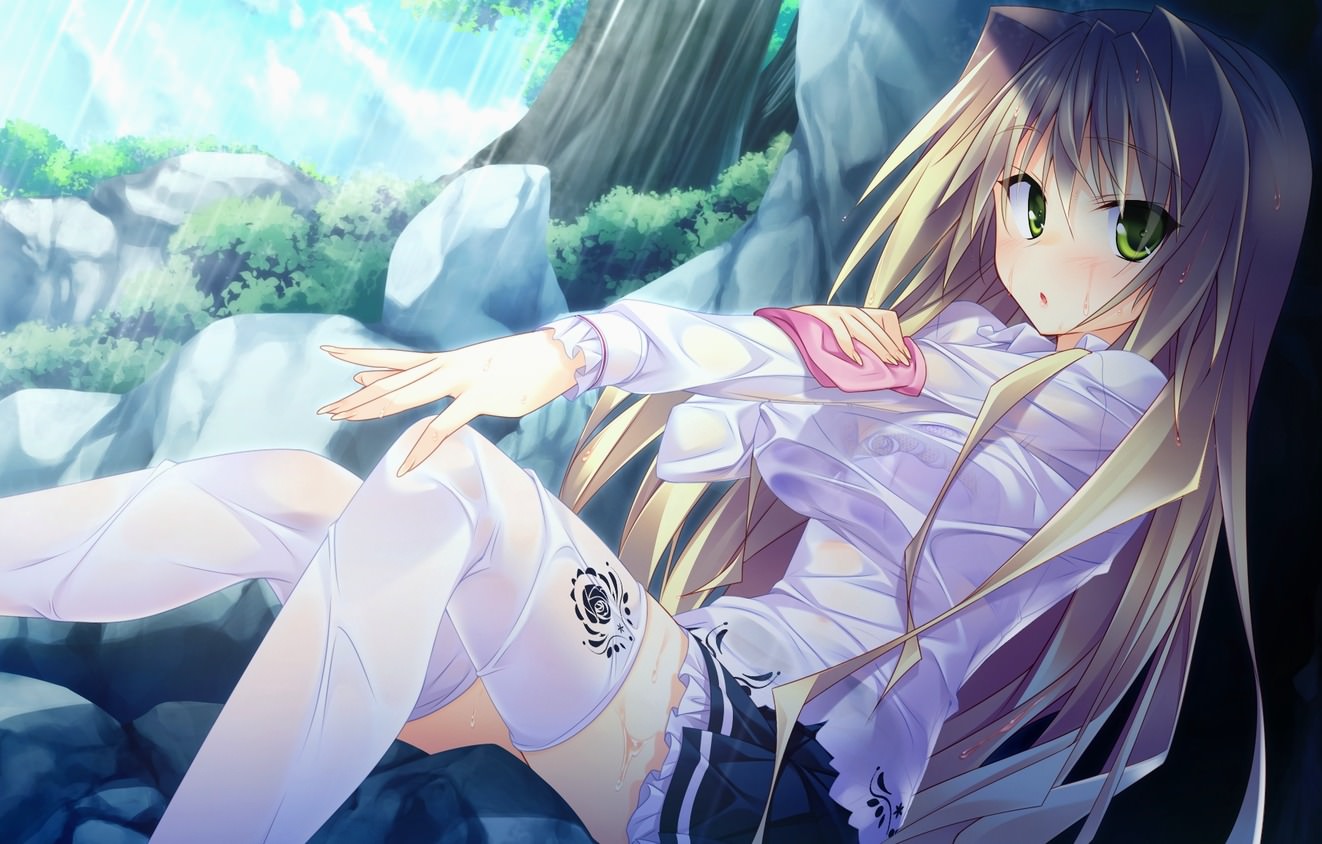 Девушка, укрылась, от, дождя, под, камнями, красивая, девушка, в, белых, чулках, в, белой, промокшей, рубашке, вытирает, себя, платком