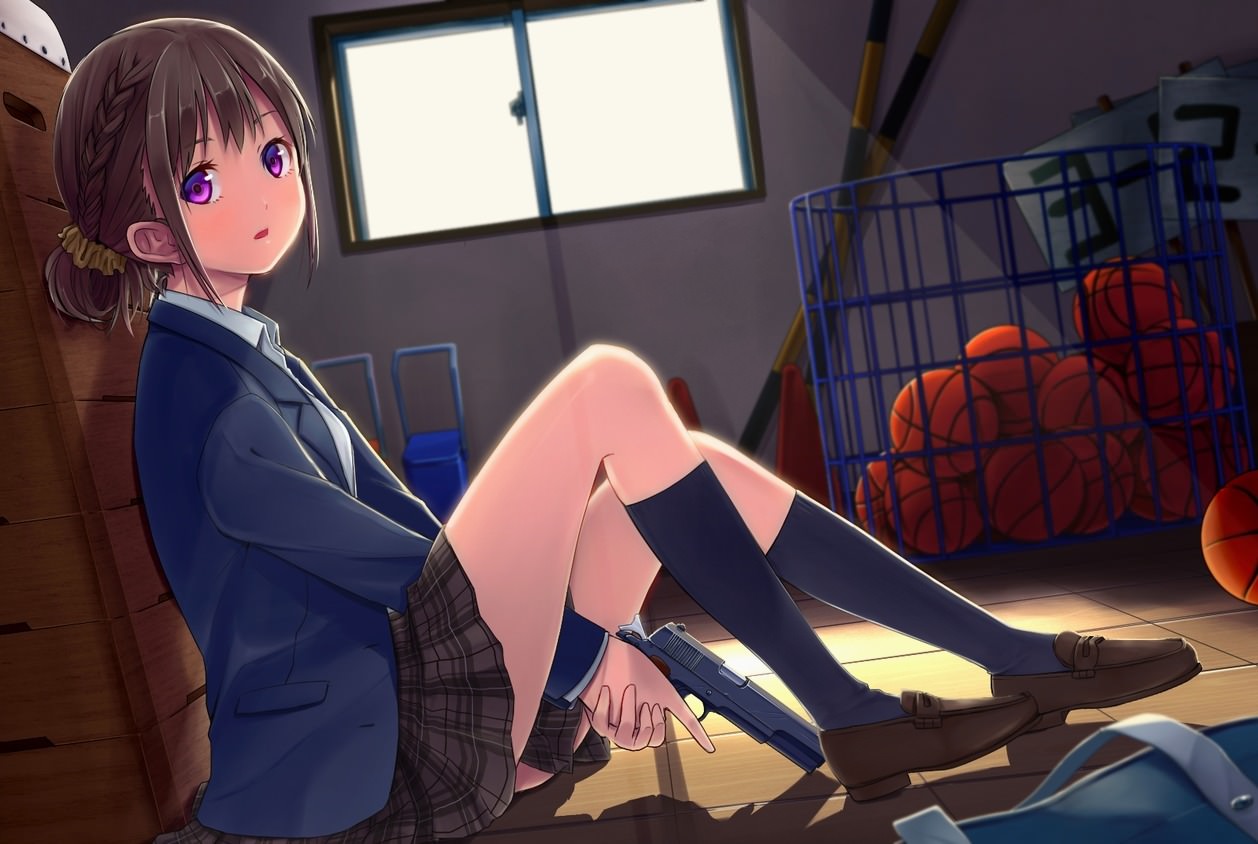 Школьница, с, кольтом, школьница, с, пистолетом, спряталась, в, комнате, со, спортивным, школьным, инвентарем