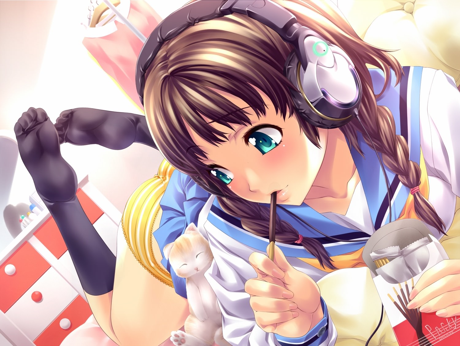 Школьница в наушниках, лакомится шоколадными палочками, в желтых трусиках и черных носочках, котенок прижался к ней, красивые изумрудные глазки.