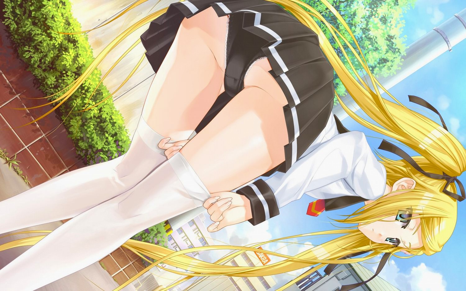 Длинноволосая блондинка поправляет чулочки на ножках, остановившись посреди улицы, короткая юбочка и черные трусики под ней.