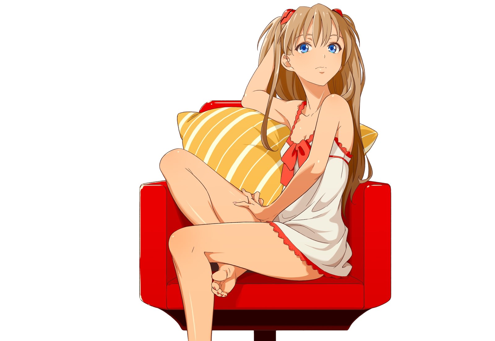 Прекрасная девушка с красивыми голубыми глазами, сидит на красном кресле в белой ночнушке, светлые волосы, очаровательное лицо и ножки, красивые глаза.