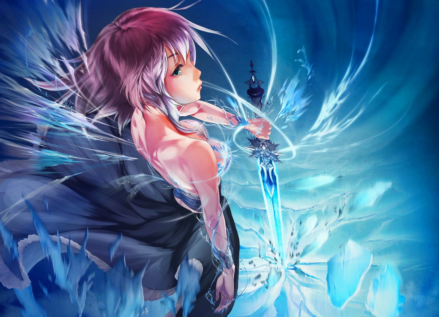 Волшебный клинок, светящийся ярким голубым светом, и его прекрасная обладательница. Красивая девушка с волшебным сверкающим мечом.