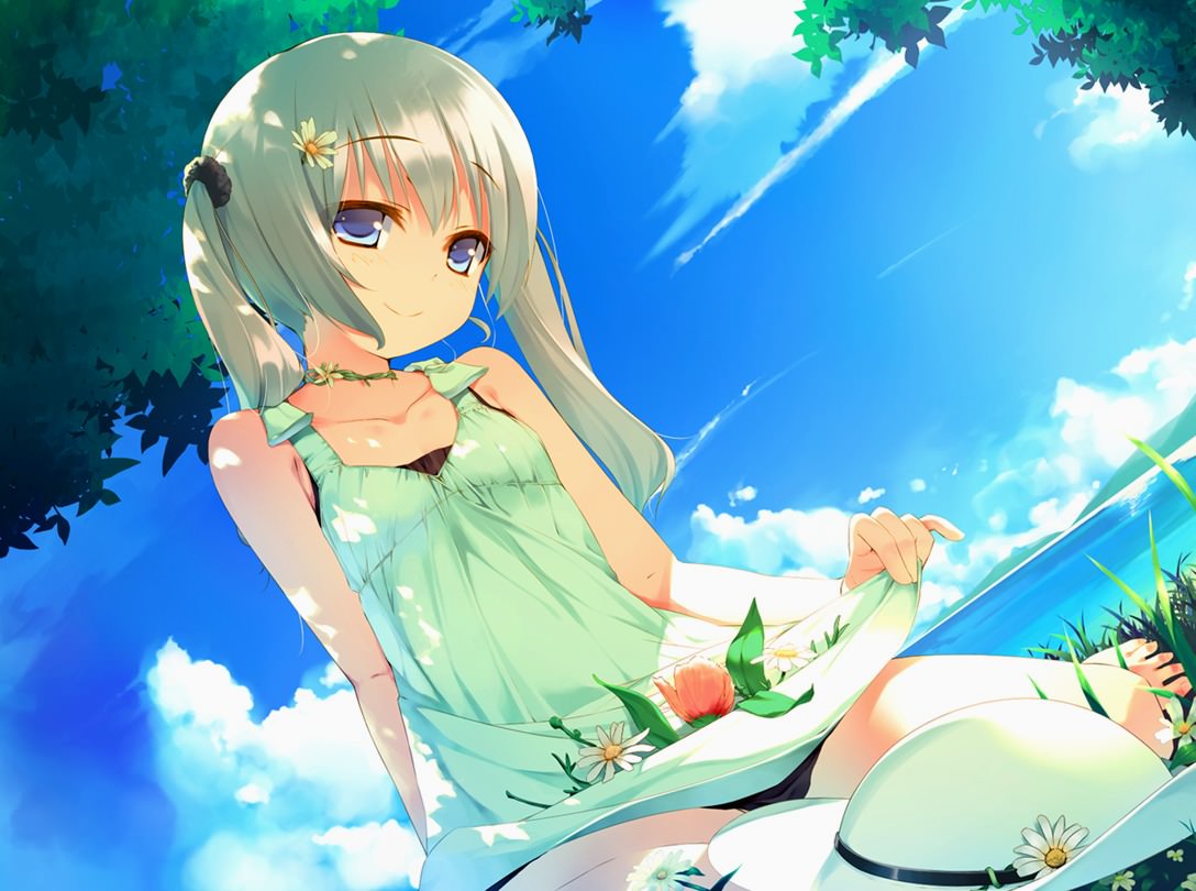 Девочка в бирюзовом платье, отдых на природе, милая девчонка в голубеньком платье слегка задирает юбочку кверху и ехидной улыбкой, сидя на травке у водоема.