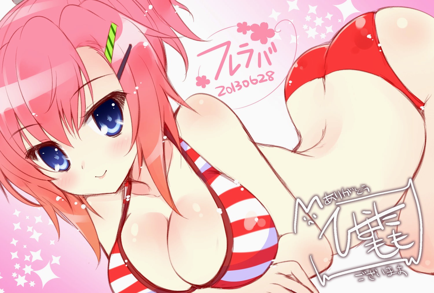 Розововолосая аниме девушка в красном бикини, красивая девушка в красных трусиках, подпирает свою грудь.