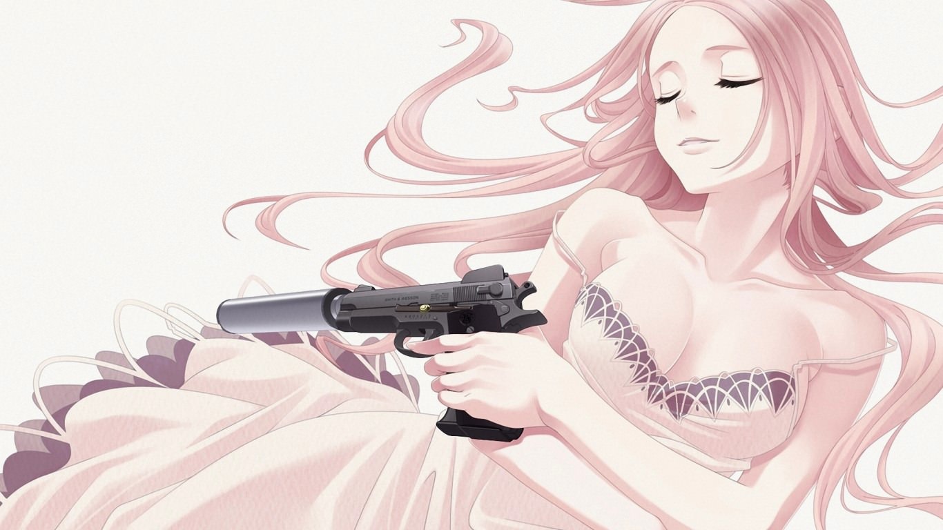 Красивая девушка с закрытыми глазками, в розовом платье, пистолет с глушителем. Очаровательная девушка с пухой.