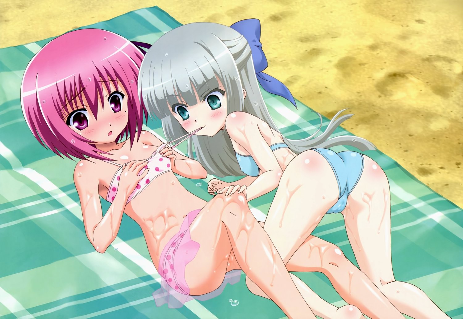 Девчонки в бикини, в креме от загара, девочка ласкает коленку подружки и зубками стягивает с нее лифчик.