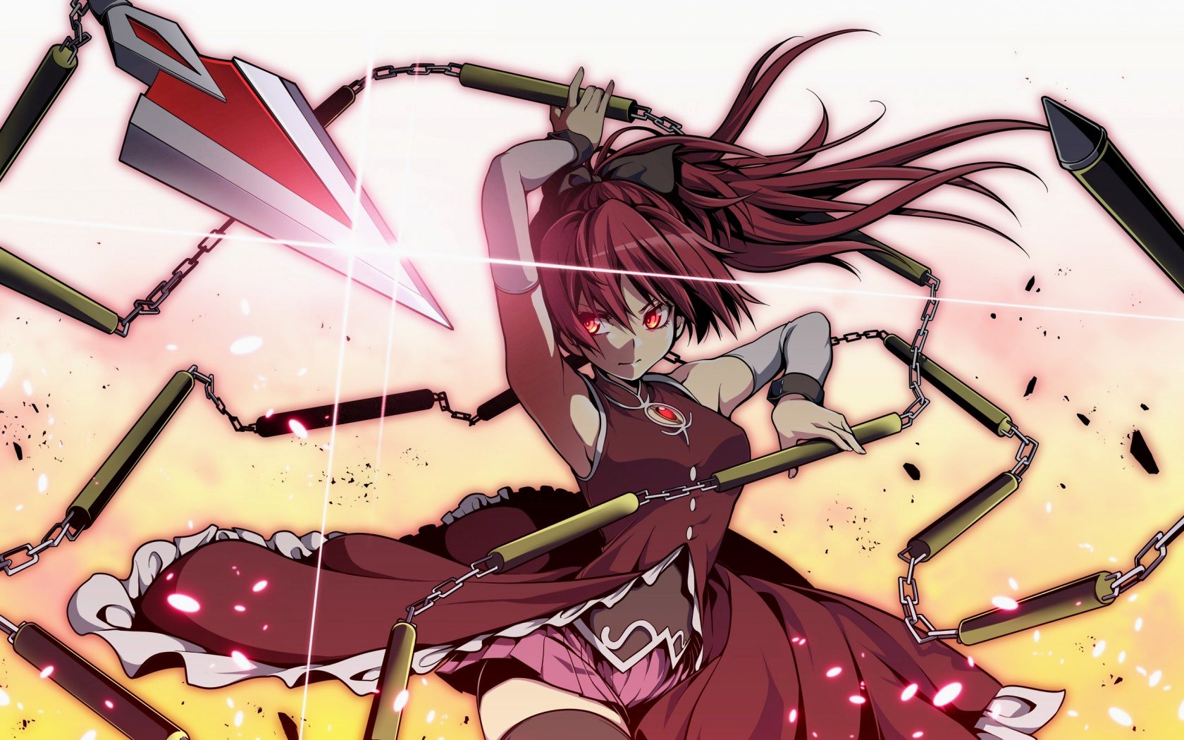 Красивая, боевая, девушка, в, красном, платье, и, опасным, оружием, в, руках, в, виде, чак, с, лезвиями, красные, глаза, блестящие, лезвия