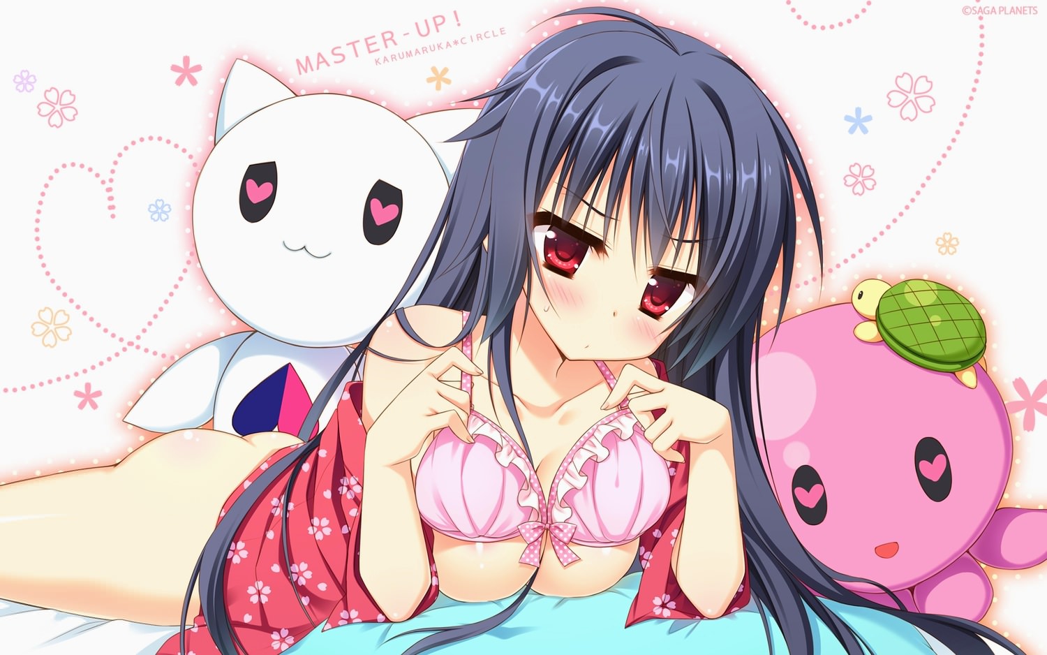 Милая девушка в розовом лифчике, без трусиков, с мягкими игрушками.