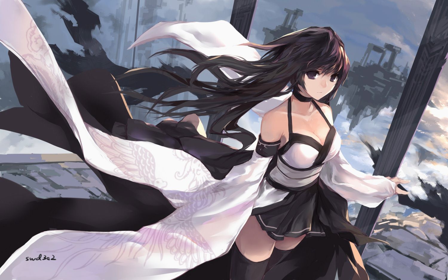 Длинноволосая, девушка, в, черно-белом, длинном, платье