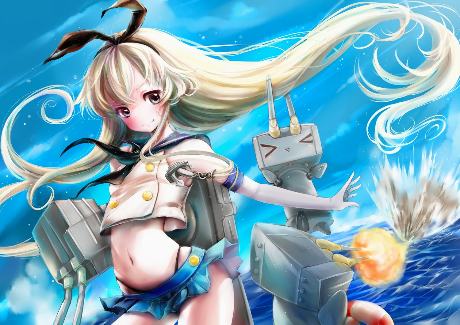 Жизнерадостная девушка в очень короткой юбке на фоне морских боев, длинные светлые волосы, секси фигурка.