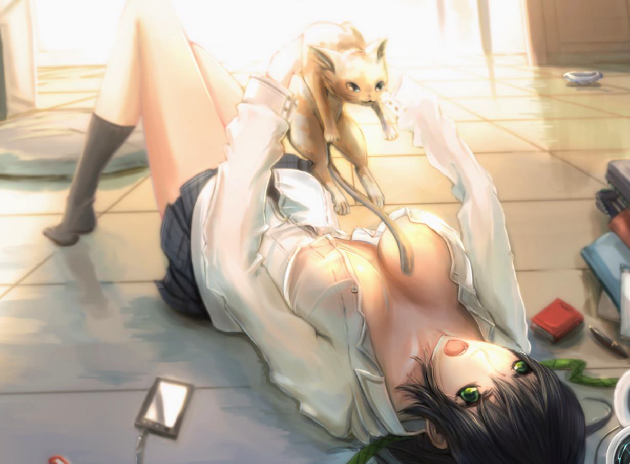 Девушка с кошкой в руках лежит на полу, не носит лифчика, большая красивая грудь и расстегнутая рубашка.
