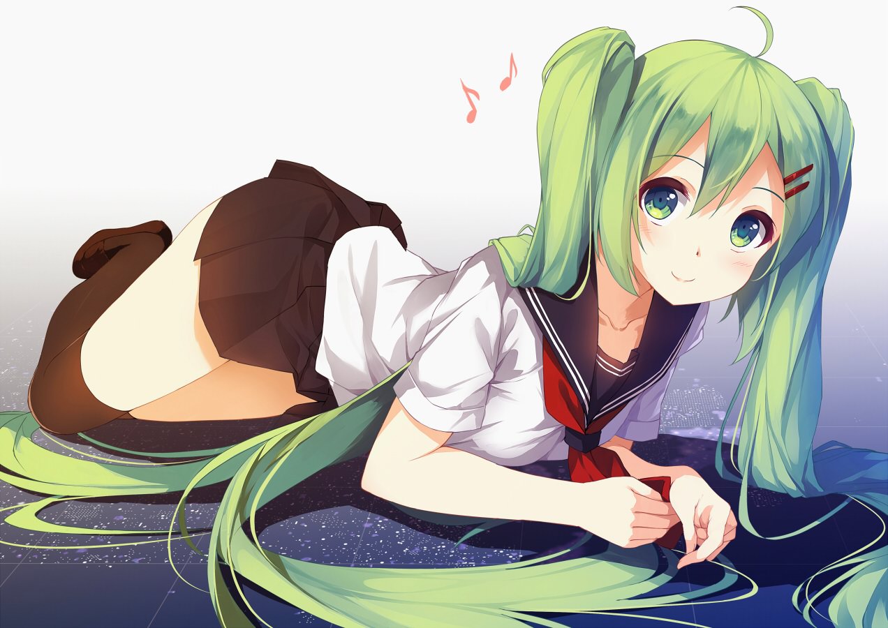 Красивая школьница с длинными светло-зелеными волосами, красивые ножки, черная юбочка, милая улыбка и красивые глазки.