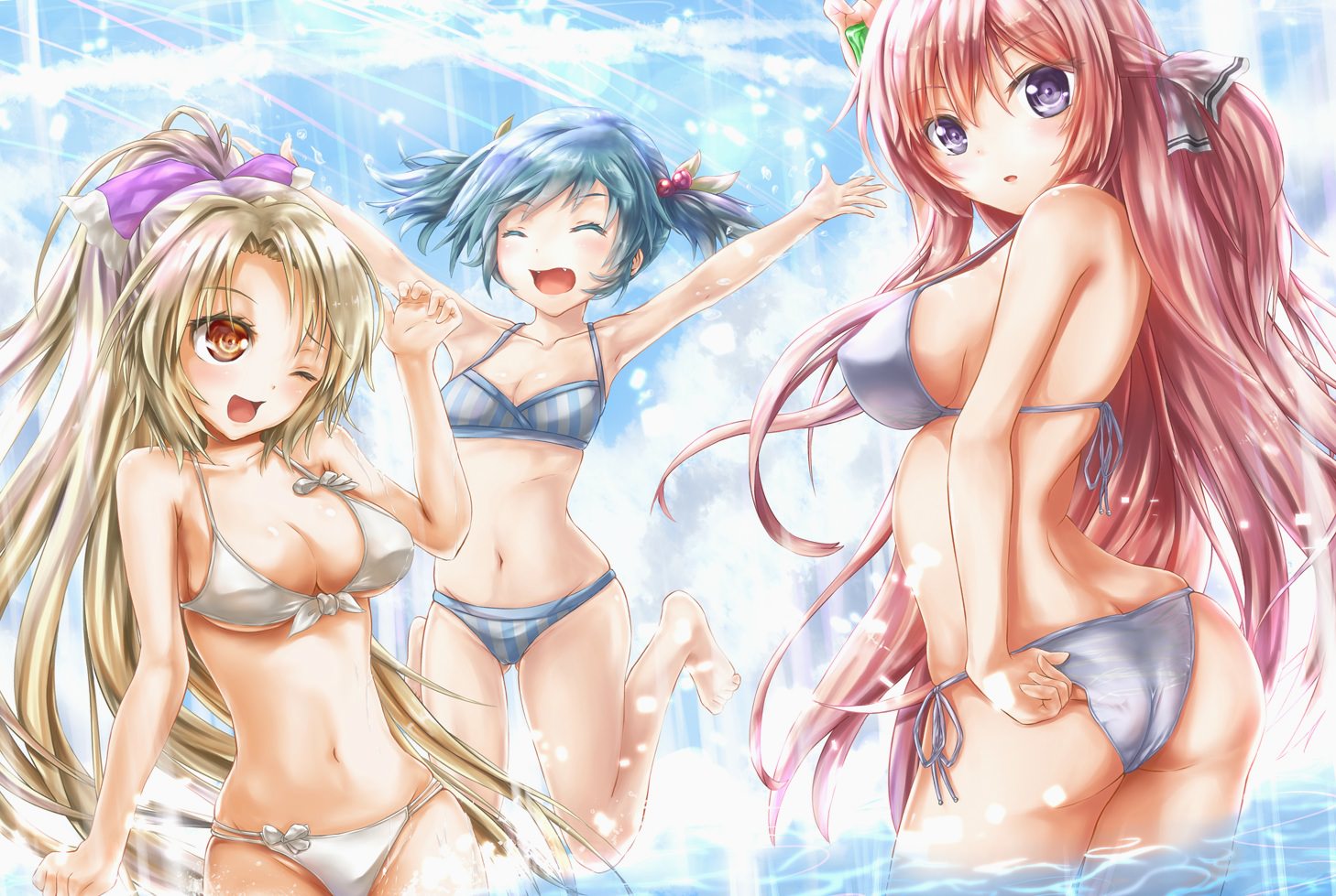 Красивые и сексуальные девушки на море, подружки в бикини дурачатся в воде.
