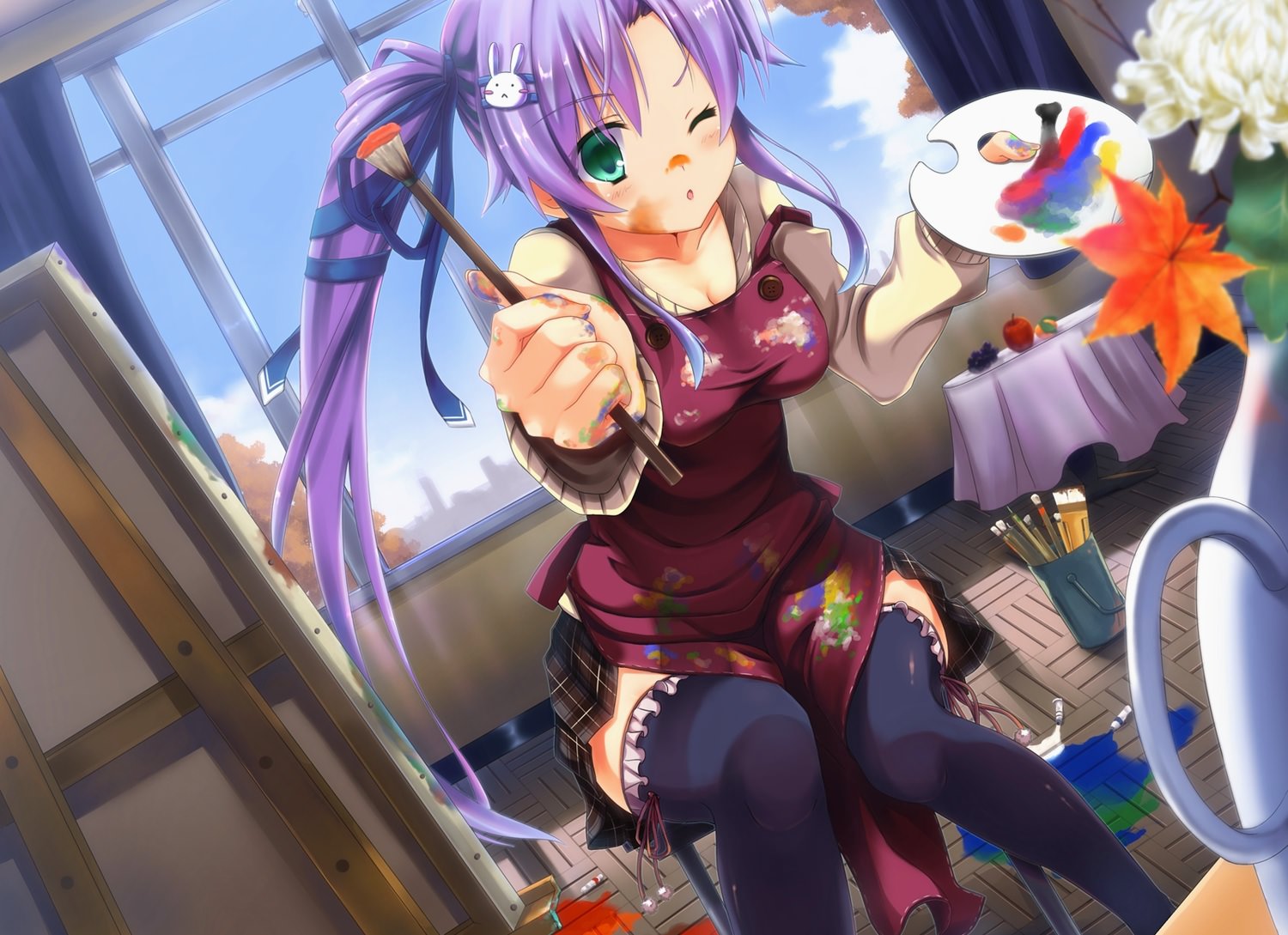 Красивая, и, забавная, девушка, художник, испачкалась, в, краске, очаровательная, девушка, с, кисточкой, для, рисования